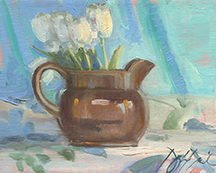 Students will mix paints and learn to mix basic strings of color to help comprehend how this preparation makes the painting process a little simpler and gets a working understanding of the value/strings of color. Students will paint from Lilacs, Tulips maybe some Hydrangea or Peonies that are available at this time of year in central Michigan. Fruit and vegetable still lifes-with arrangements of bowls and china plates and bold graphic table coverings, with strong side lighting make for a wonderful alternative subject to the florals.The thought Douglas puts into these classic arrangements and timeless subjects is as important as the painting itself. He will show you how he does it and why he makes the choices he does. A discussion on the pitchers, vases and vessels he chooses along with the cloth and fabric samples he uses will be included.